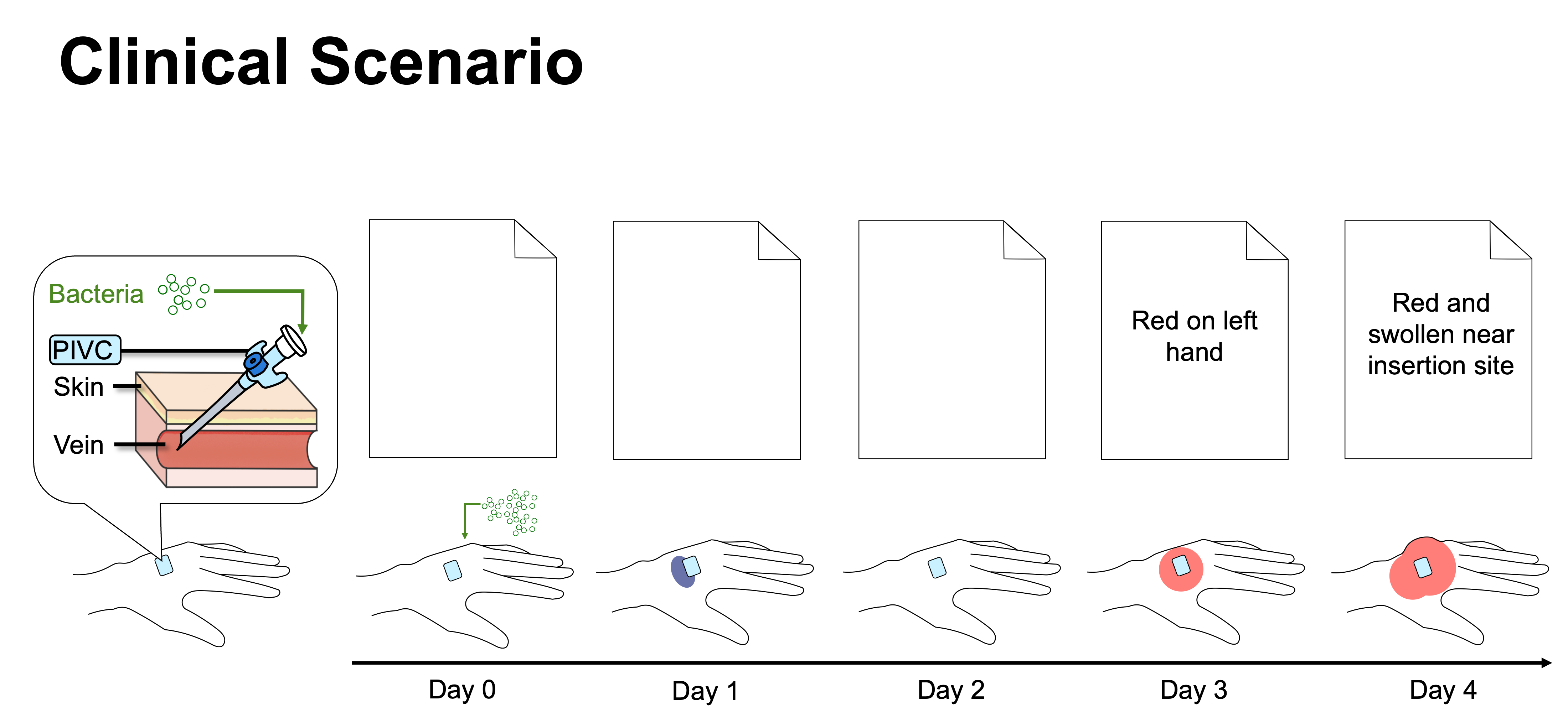 Use Case: In the clinical scenario, a hospitalized patient receives a peripheral intravenous catheter (PIVC) and bacteria enters. The early days show no documentation despite the catheter’s presence and bruising, while later visible inflammation is documented as “red” or “red and swollen near insertion site”. This illustrates a gap between actual events vs clinician documentation.